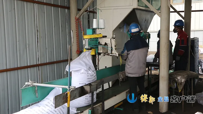 △工人在包装车间操作设备,对袋装农资产品进行封口作业