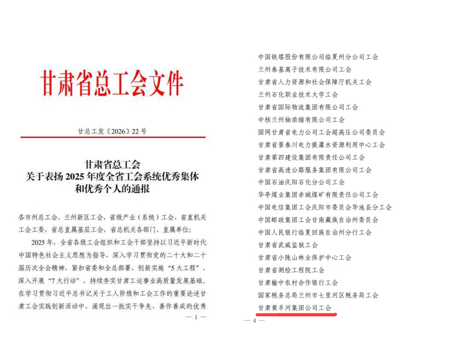近日,甘肃省总工会印发《关于表扬2025年度全省工会系统优秀集体和优秀个人的通报》,黄羊河集团公司工会凭借扎实的工作基础、规范的运行机制、突出的服务成效,从全省各级工会组织中脱颖而出,成功入选50个优秀集体名单。
