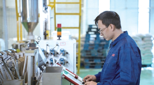 亚美特公司生产车间作业人员正在调试滴灌生产线设备参数。张良 摄